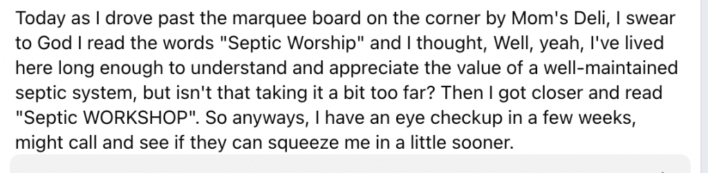 A commenter fills in the gaps for us and envisions an entire afterlife system. “It’s not just you! Same thing happened to me!! I laughed and proceeded to consider what septic worship could mean even though I had realized quickly that my initial read was incorrect. Didn’t matter at that point, the image lives in the brain’s mainframe and is processing the many different possibilities. I visualized heaven and hell as systems involving functioning and nonfunctioning septic systems with varying degrees of overlap and overflow.”